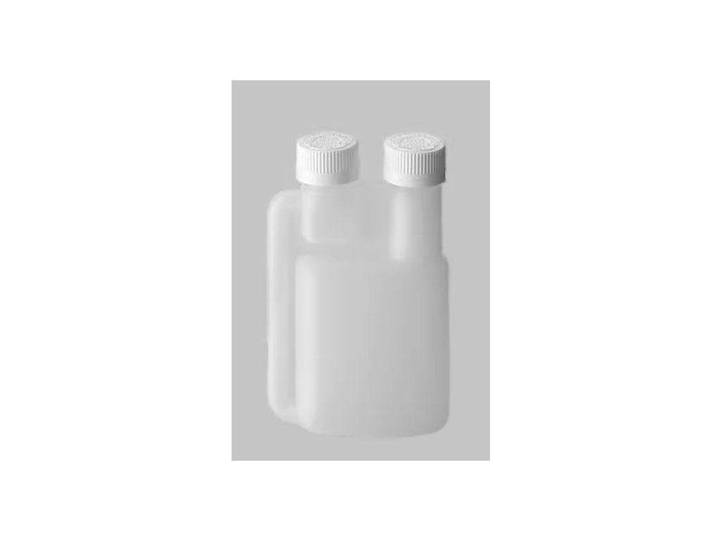 Plastová lahev má dva uzávěry s možností dávkování dezinfekčních přípravků. Na lahvi vyznačena odměrka.