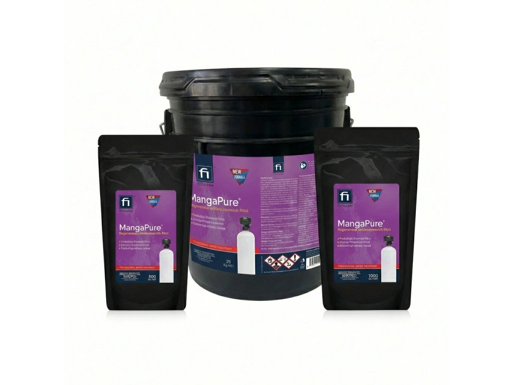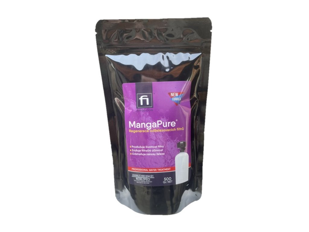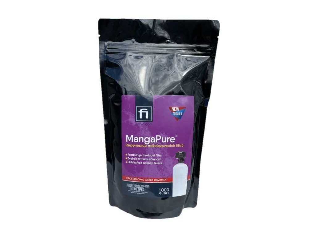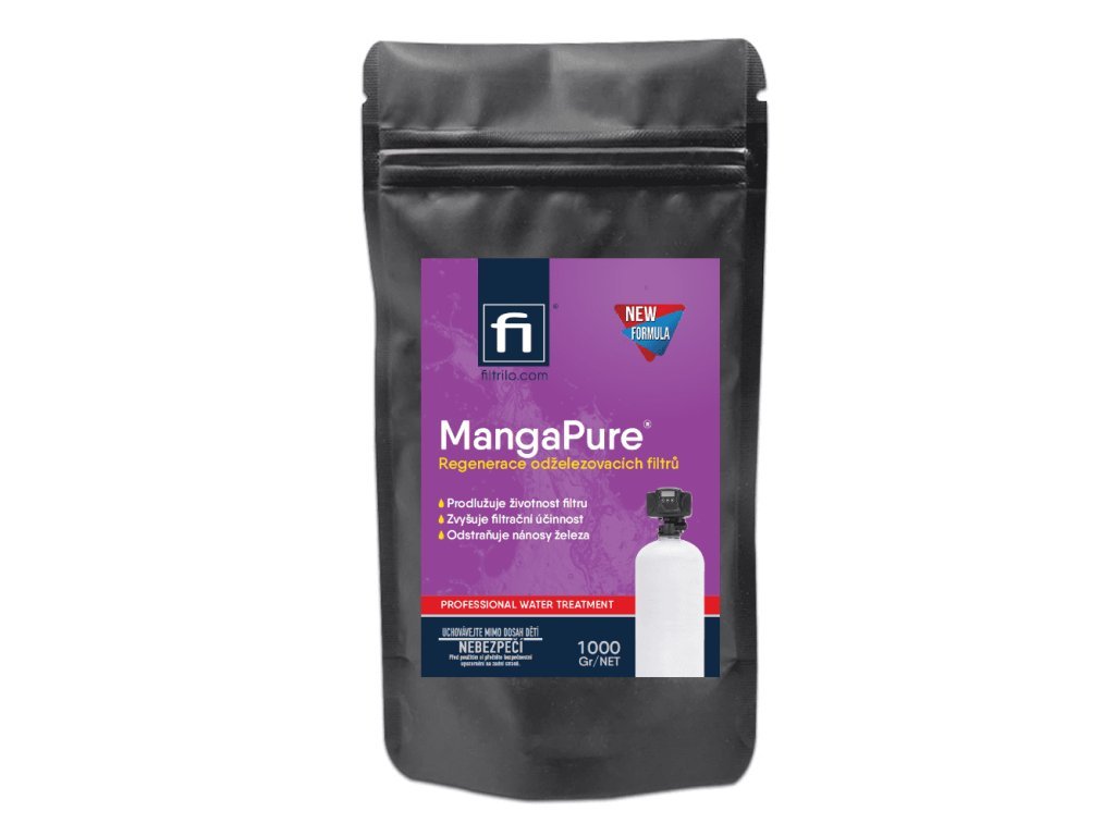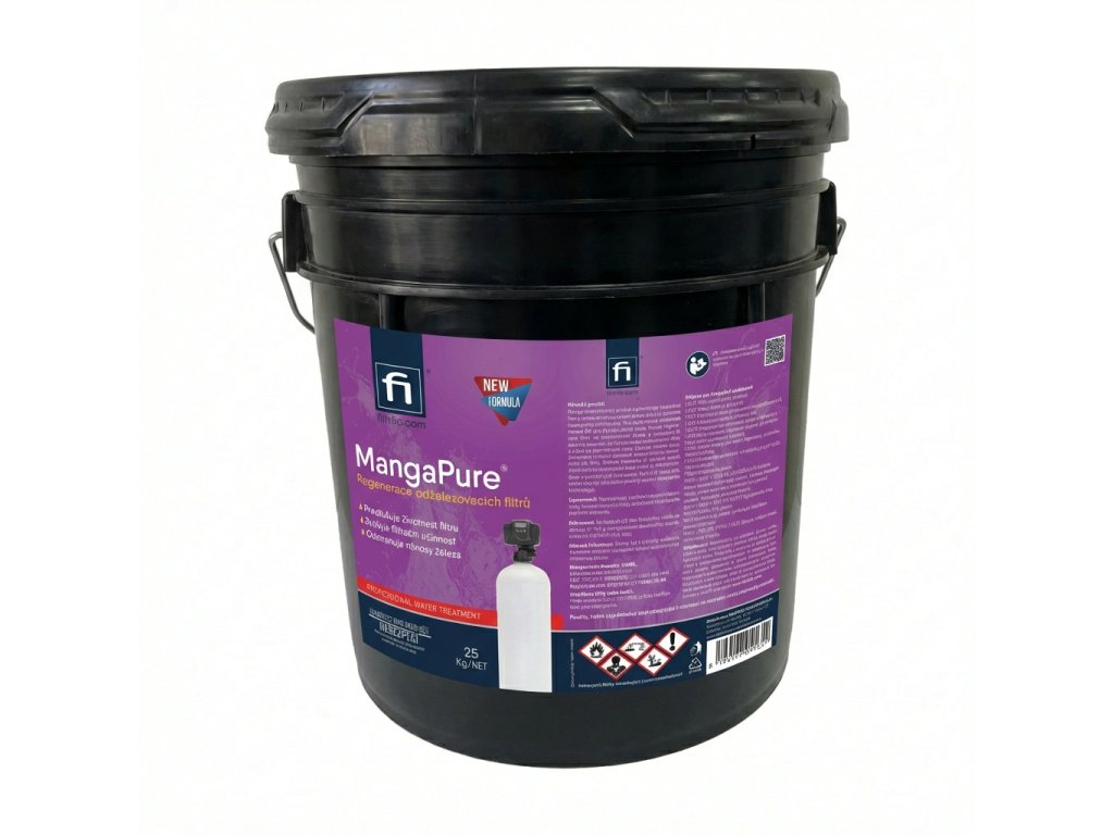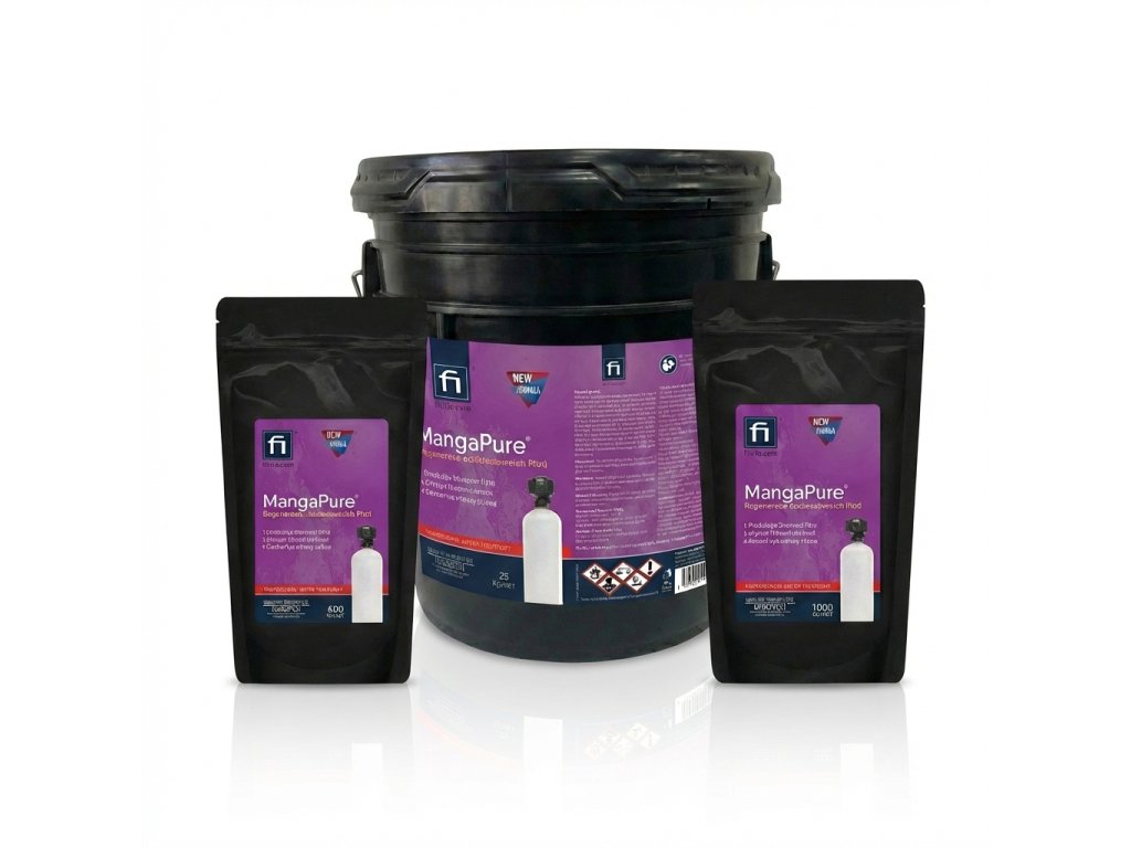 MangaPure je určen k regeneraci filtračních materiálů pro odstraňování železa a manganu například Greensand. MangaPure byl speciálně vyvinutý k odstranění extrémního nahromadění železa z greensandu. Toto silné oxidační činidlo se snadno používá a obnoví váš železný filtr zpět na špičkový výkon. MangaPure má silně okysličovací schopnost a při jejím rozpuštění ve vodě vzniká růžový až fialový roztok v závislosti na koncentraci. MangaPure se používá jako dezinfekce, antiseptikum a jako účinný oxidant pro rozpuštěné železo a mangan ve vodě, které je přeměňuje z rozpuštěného stavu na pevný a následně je odfiltrováno na pískových filtrech. Ničí plísně a bakterie. MangaPure se též používá k regeneraci dalších druhů filtrů pro odstraňování železa a manganu.