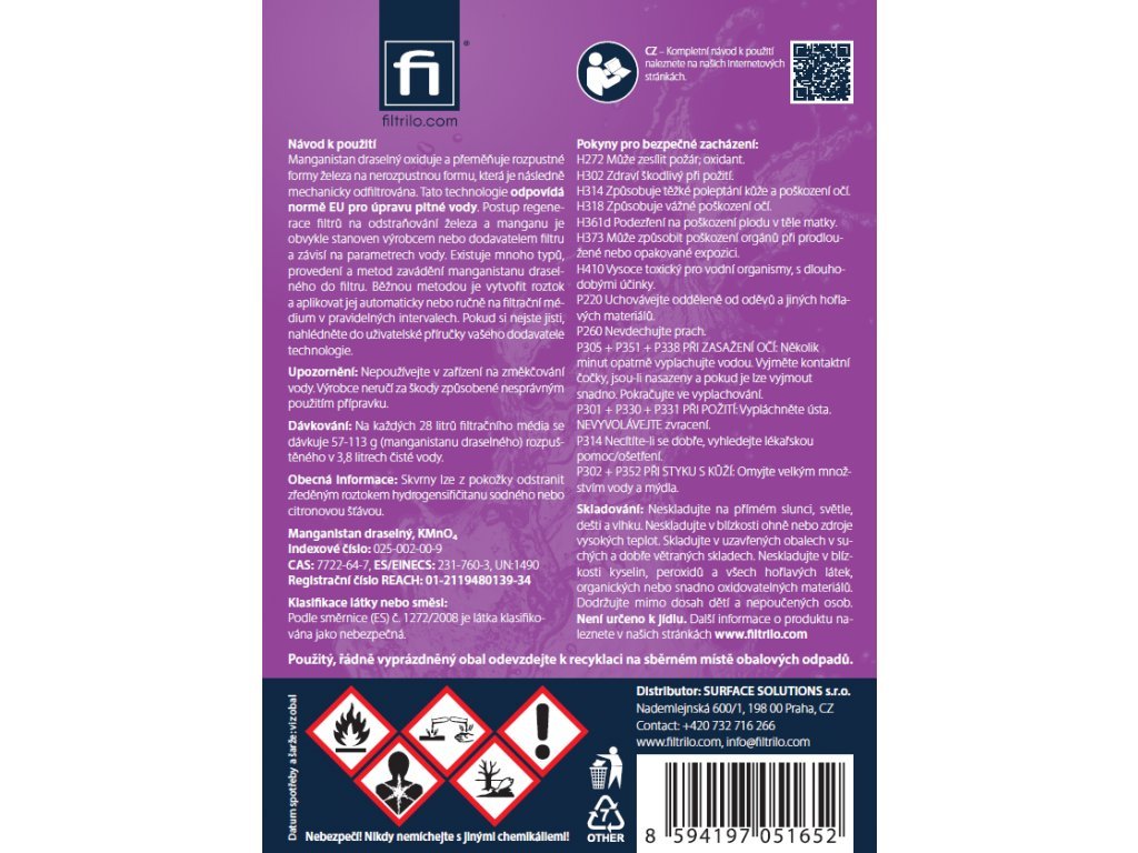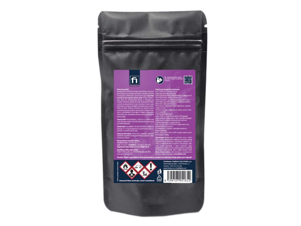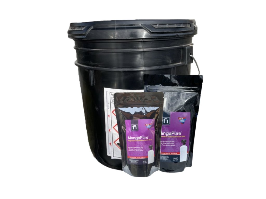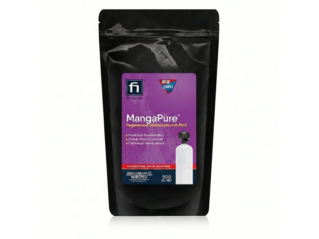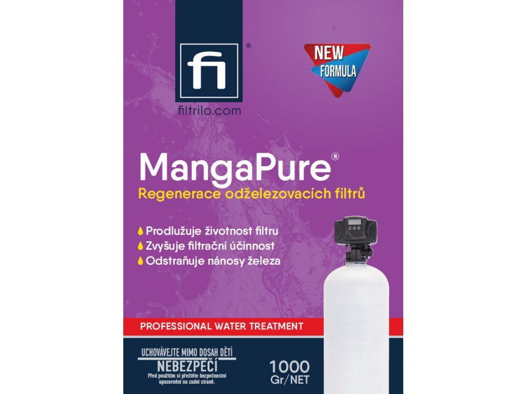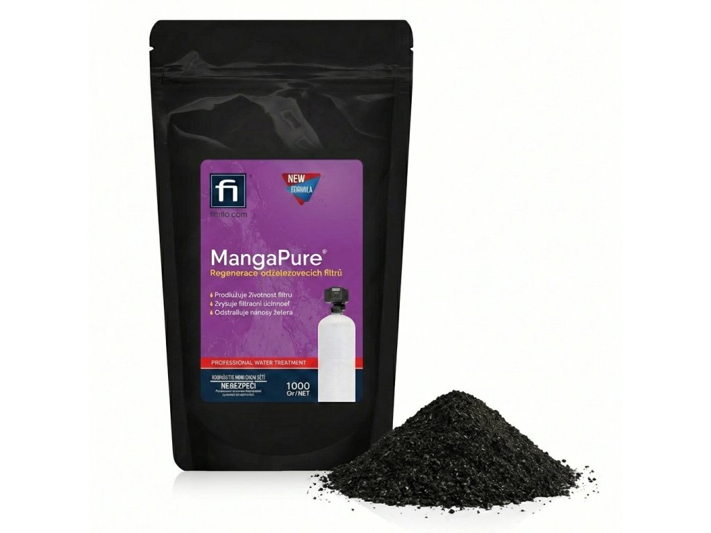 MangaPure je určen k regeneraci filtračních materiálů pro odstraňování železa a manganu například Greensand. MangaPure byl speciálně vyvinutý k odstranění extrémního nahromadění železa z greensandu. Toto silné oxidační činidlo se snadno používá a obnoví váš železný filtr zpět na špičkový výkon. MangaPure má silně okysličovací schopnost a při jejím rozpuštění ve vodě vzniká růžový až fialový roztok v závislosti na koncentraci. MangaPure se používá jako dezinfekce, antiseptikum a jako účinný oxidant pro rozpuštěné železo a mangan ve vodě, které je přeměňuje z rozpuštěného stavu na pevný a následně je odfiltrováno na pískových filtrech. Ničí plísně a bakterie. MangaPure se též používá k regeneraci dalších druhů filtrů pro odstraňování železa a manganu.