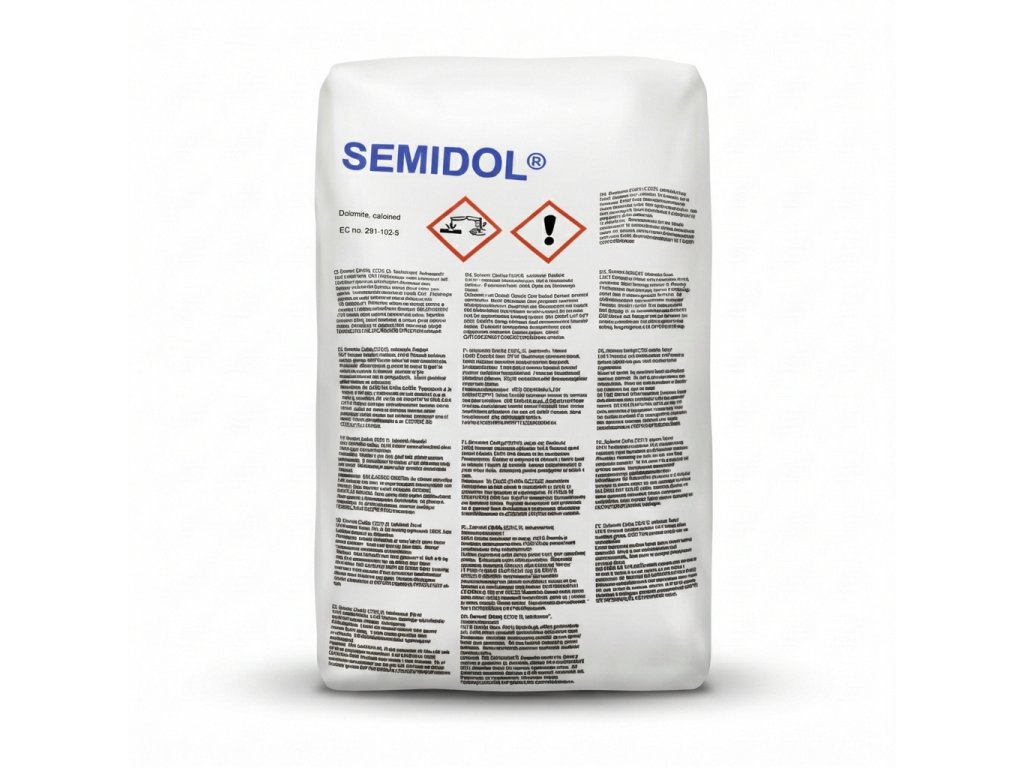 Polovypálený dolomitický uhličitan vápenatý k mineralizaci a zvýšení pH (odkyselení). Semidol je dolomitický materiál určený pro odkyselení – zvýšení pH v kontinuálním provozu. Semidol je testován a schválen dle norem DIN 19621 a DIN 2000 pro úpravu pitné vody, bazénové vody a technologické vody. Využívá se ke zvýšení hodnot vápníku (Ca) a hořčíku (Mg). Semidol je polovypálený dolomit, který se získává ze surového dolomitu tepelnou úpravou. Probíhá částečné odkyselení CaMg (CO3)2 na CaCO3 x MgO.